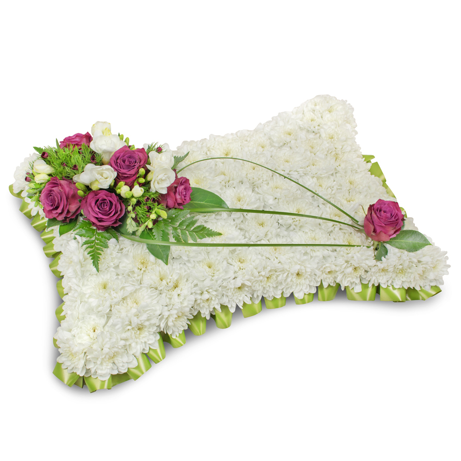 Express your sincerest condolences with our heartwarming pillow-shaped floral arrangement. This beautiful bouquet showcases white chrysanthemums, purple roses, white freesias, dianthus, and bear grass, each flower carefully chosen for its exceptional quality and freshness.