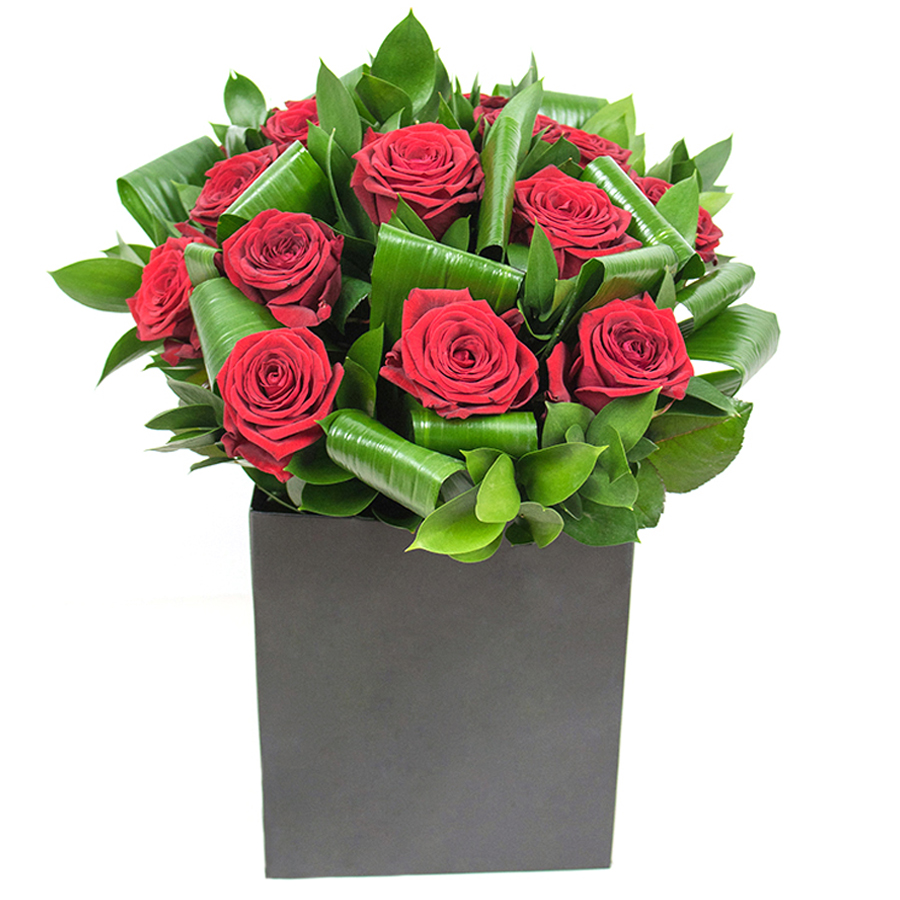 Celebrate beauty with our stunning bouquet of red roses, enhanced by aspidistra leaves and ruscus.